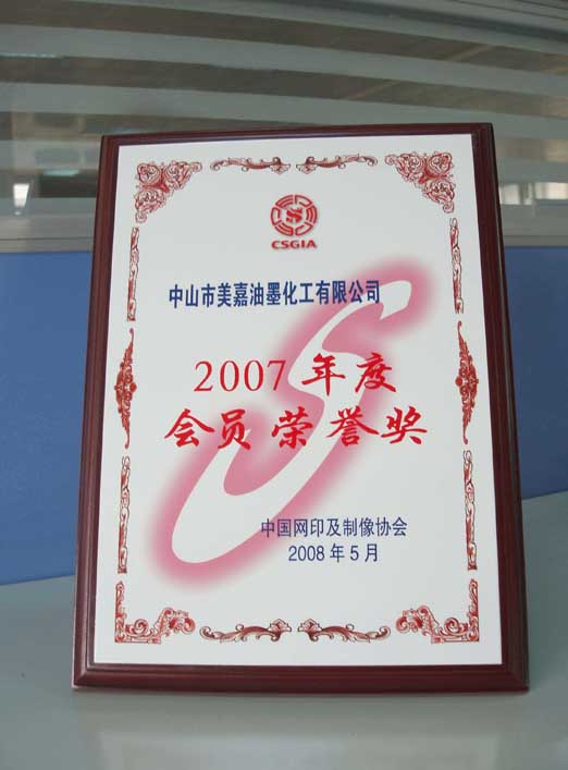 2008年5月,張總至杭州參加中國網(wǎng)印及制像協(xié)會相關(guān)會議時。大會為公司頒發(fā)了“2007年度會員榮譽(yù)獎”,以致表彰美嘉公司在協(xié)會及油墨行業(yè)中所做出的貢獻(xiàn)。